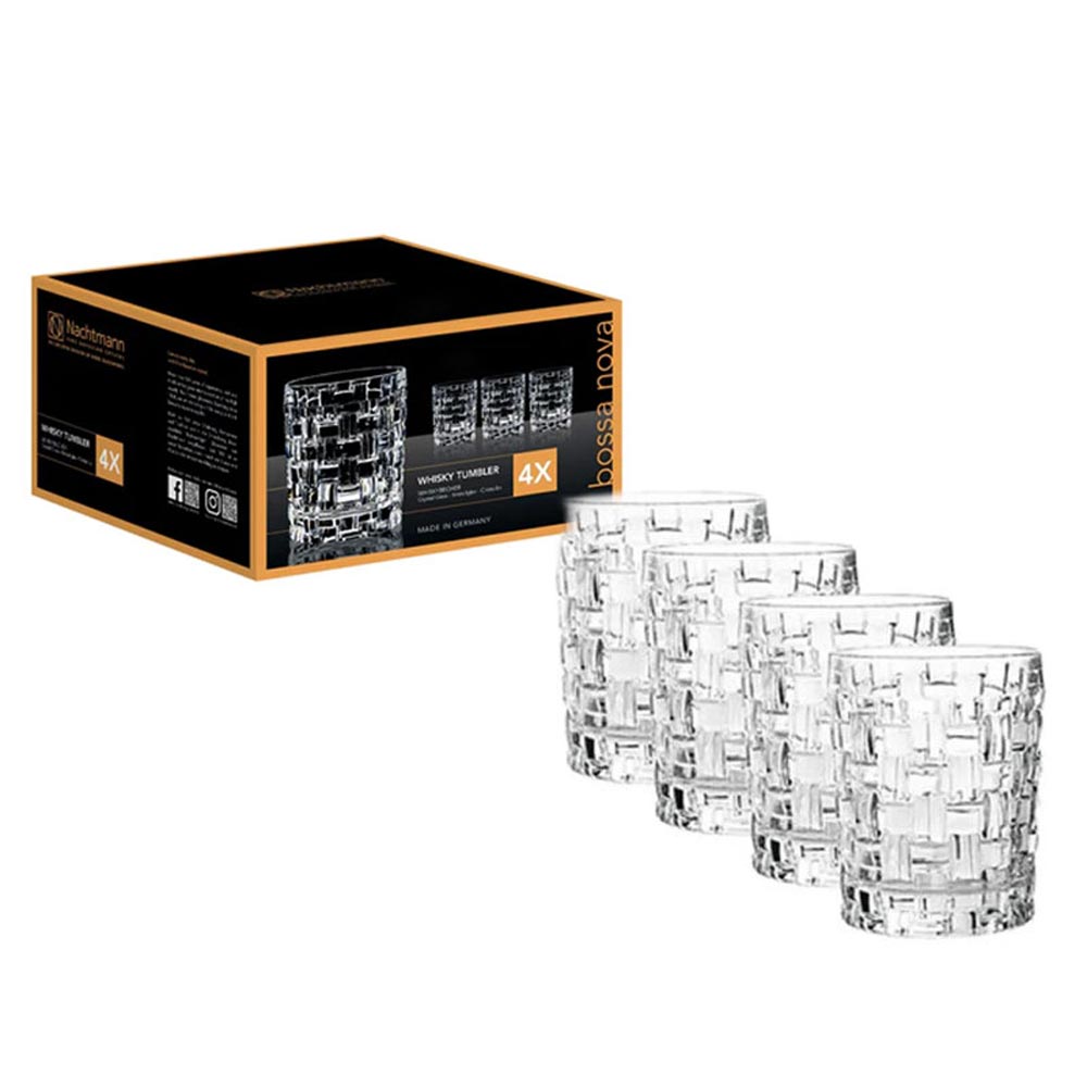 This set contains 4 pieces Bossa Nova Whisky tumblers. The brilliant machine-made tumbler of the popular glass collection Bossa Nova adds sparkle to every day as well as festive table decorations. Use this glass to enjoy whiskey as well as mixdrinks or nonalcoholic beverages. Bossa Nova tableware adds interest to the table decoration with the same cool sensibility as the dance for which it is named. As all NACHTMANN crystal this item is dishwasher safe.